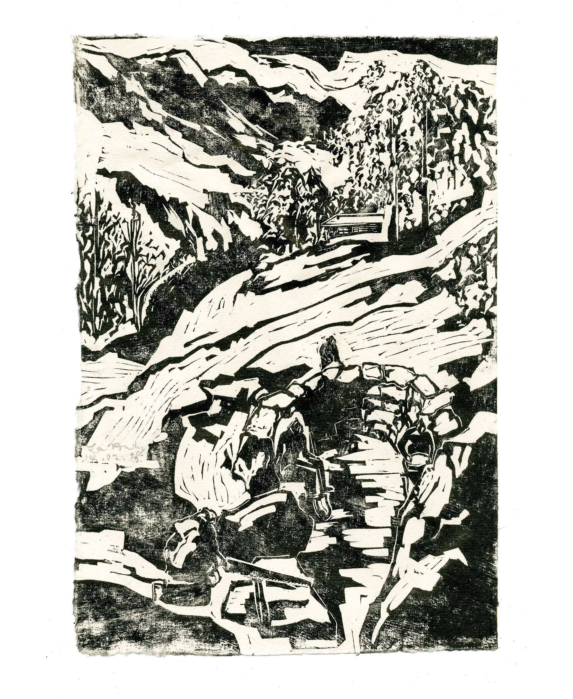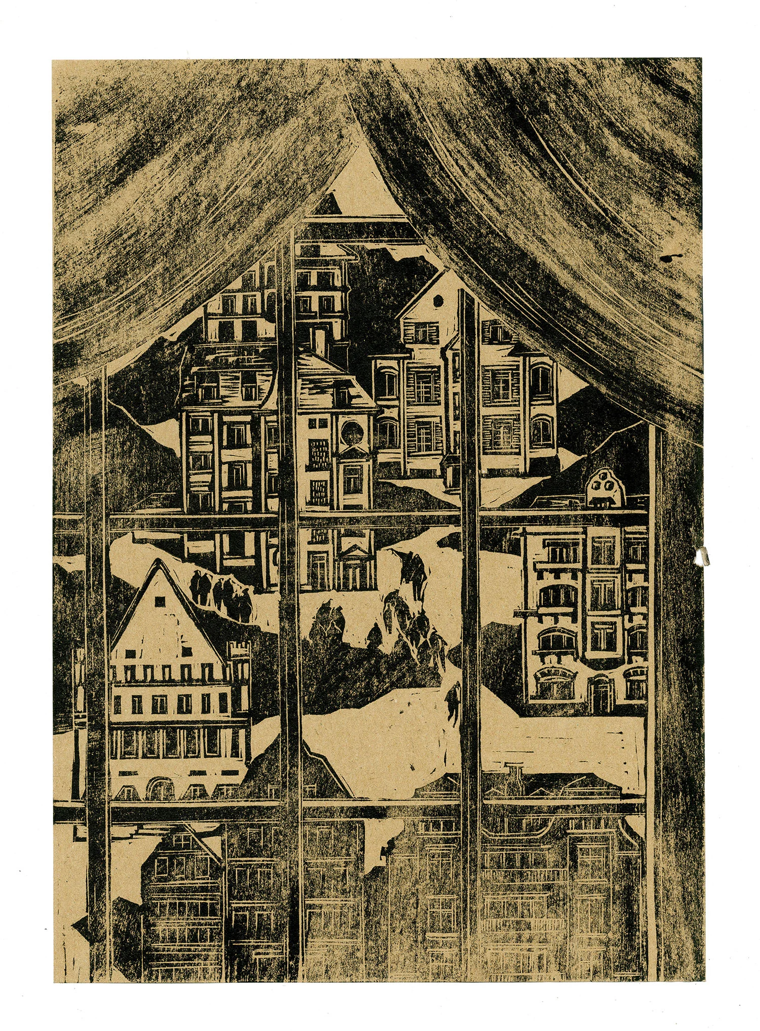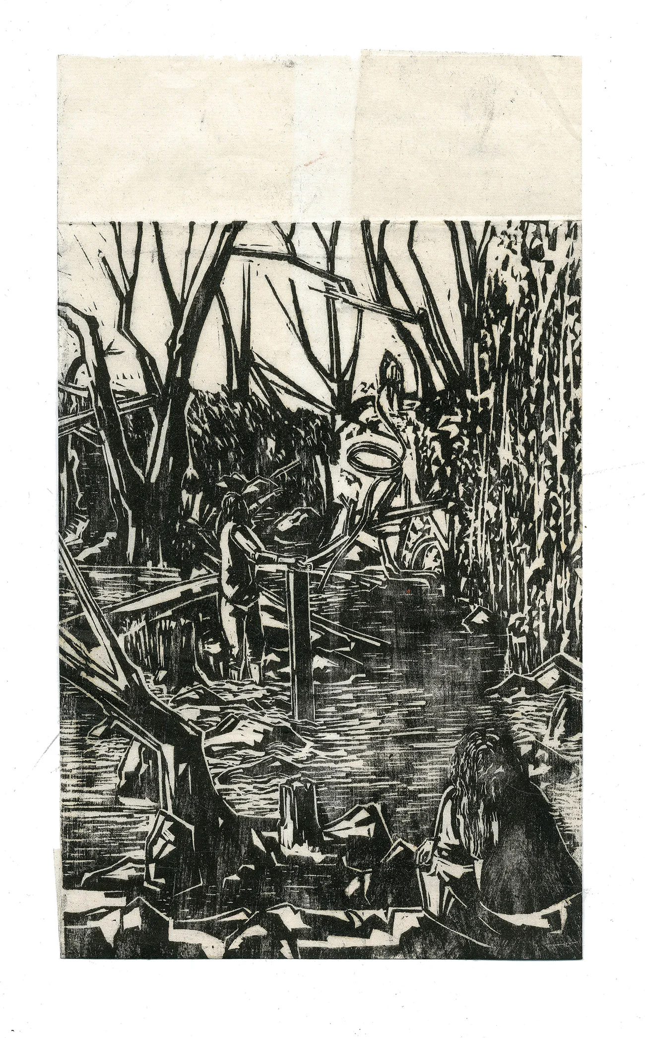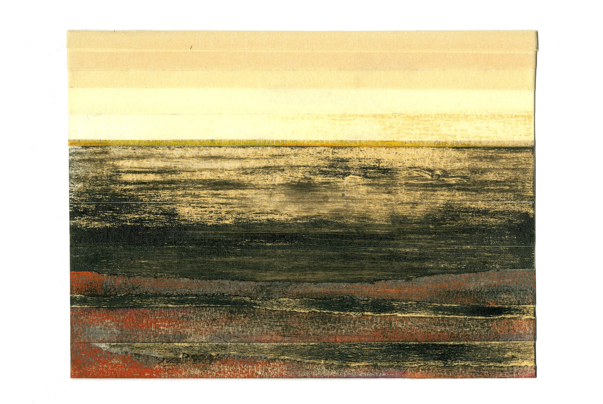Linocut printed with Xi-ling seal paste, oil pastel on tape on paper