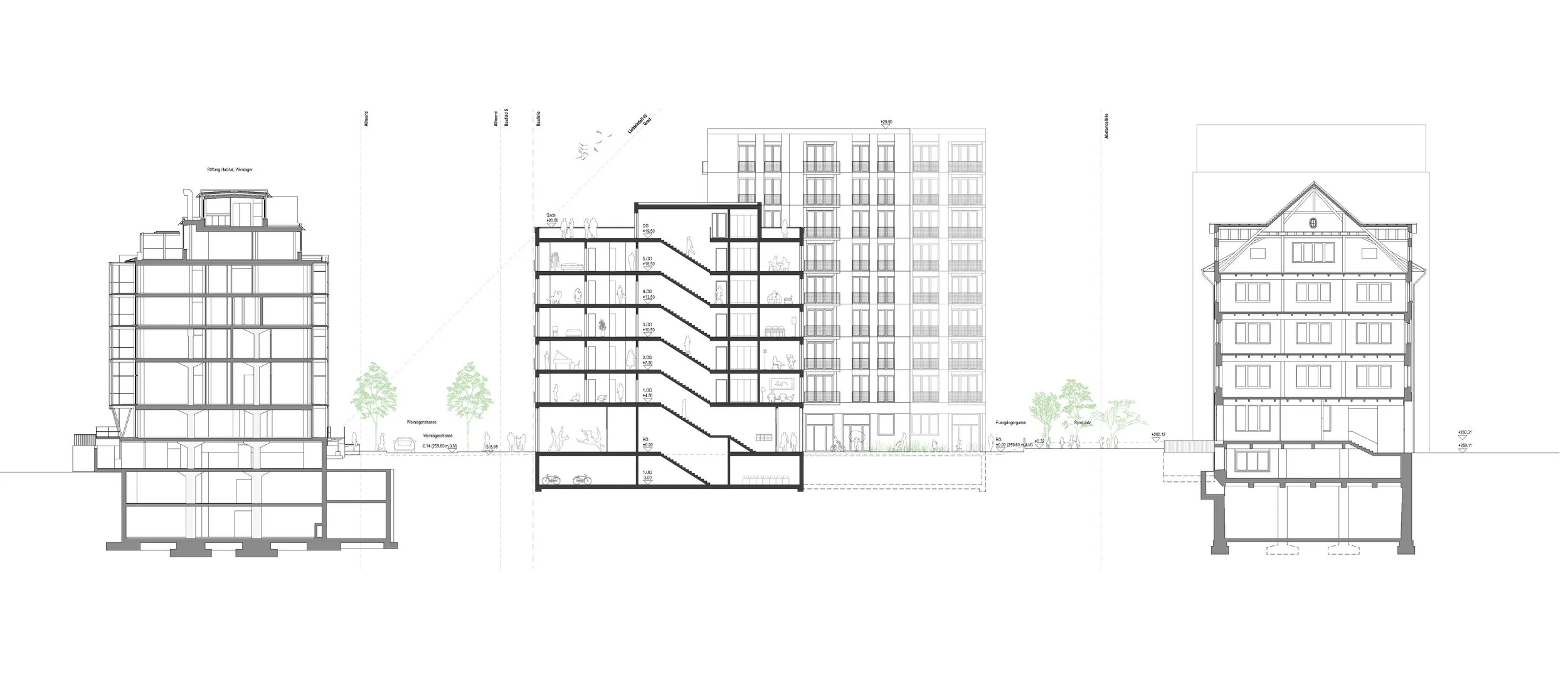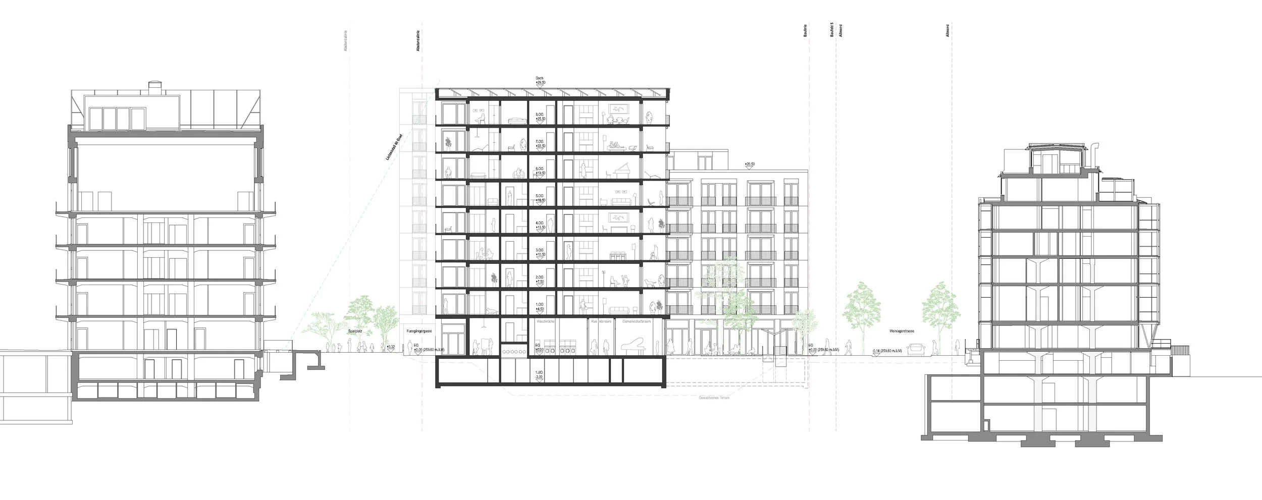 Das Doppelkamm-Gebäude besteht aus drei neungeschossigen Häusern sowie zwei sechsgeschossigen Häusern. Diese verzahnte Höhenentwicklung ist einerseits eine direkte Übersetzung der Abstands- und Belichtungsregelung, andererseits aber auch eine Reaktion auf umliegende Bestandsgebäude. Die dadurch entstandene, zweigliedrige Westfassade, nimmt die Fassadenhöhe nördlich der Schule und südlich des Weinlagers auf. Gesucht wird stets nach einer Balancierung zwischen der Autonomie des Gebäudes und der Vermittlung der Umgebung. Mit einer Wiederholung der nord- und südseitigen Köpfen wird versucht den Baukörper trotz sorgfältigem Umgang mit der Umgebung dennoch als typologiestarker Stadtbaustein selbstbewusst zu positionieren.