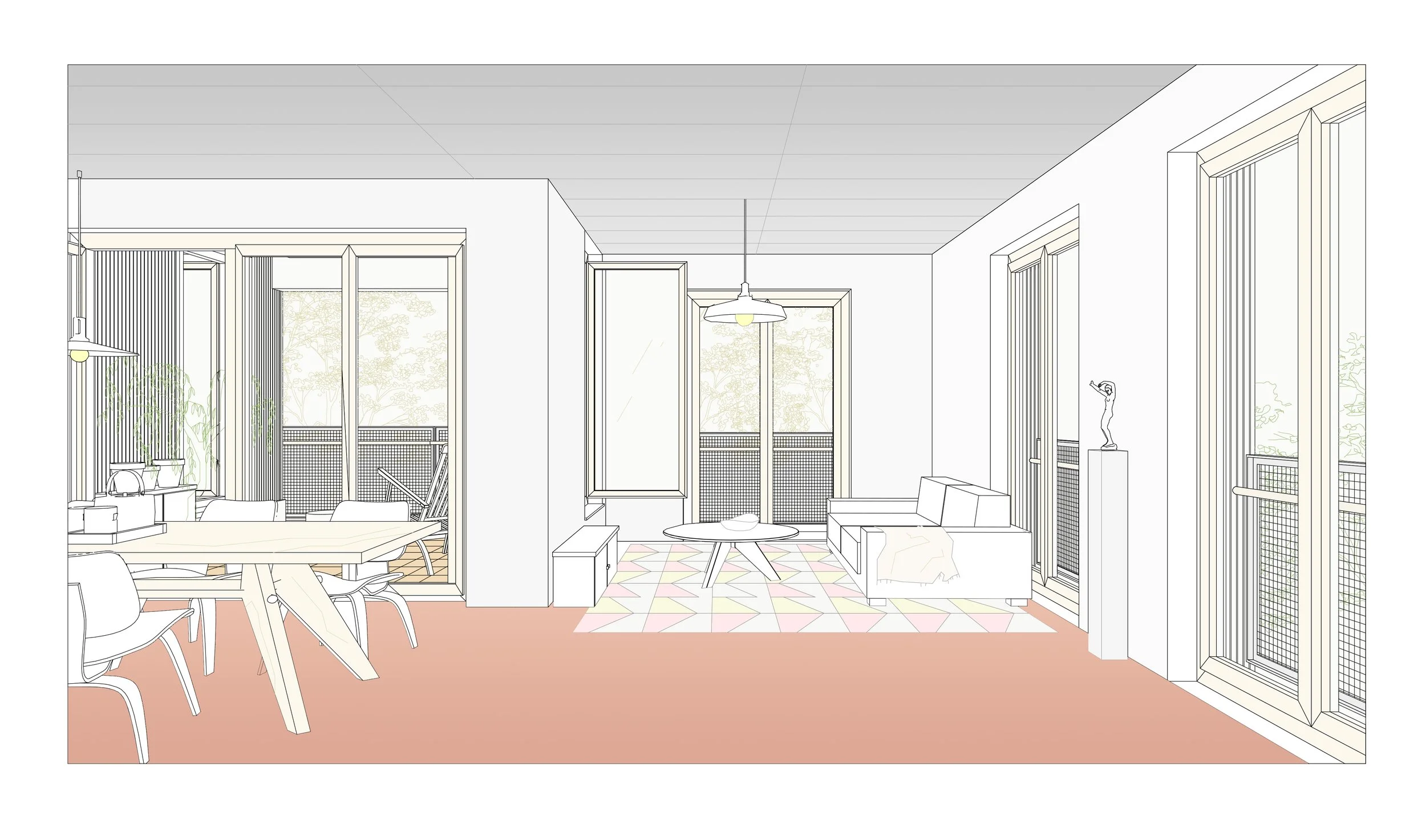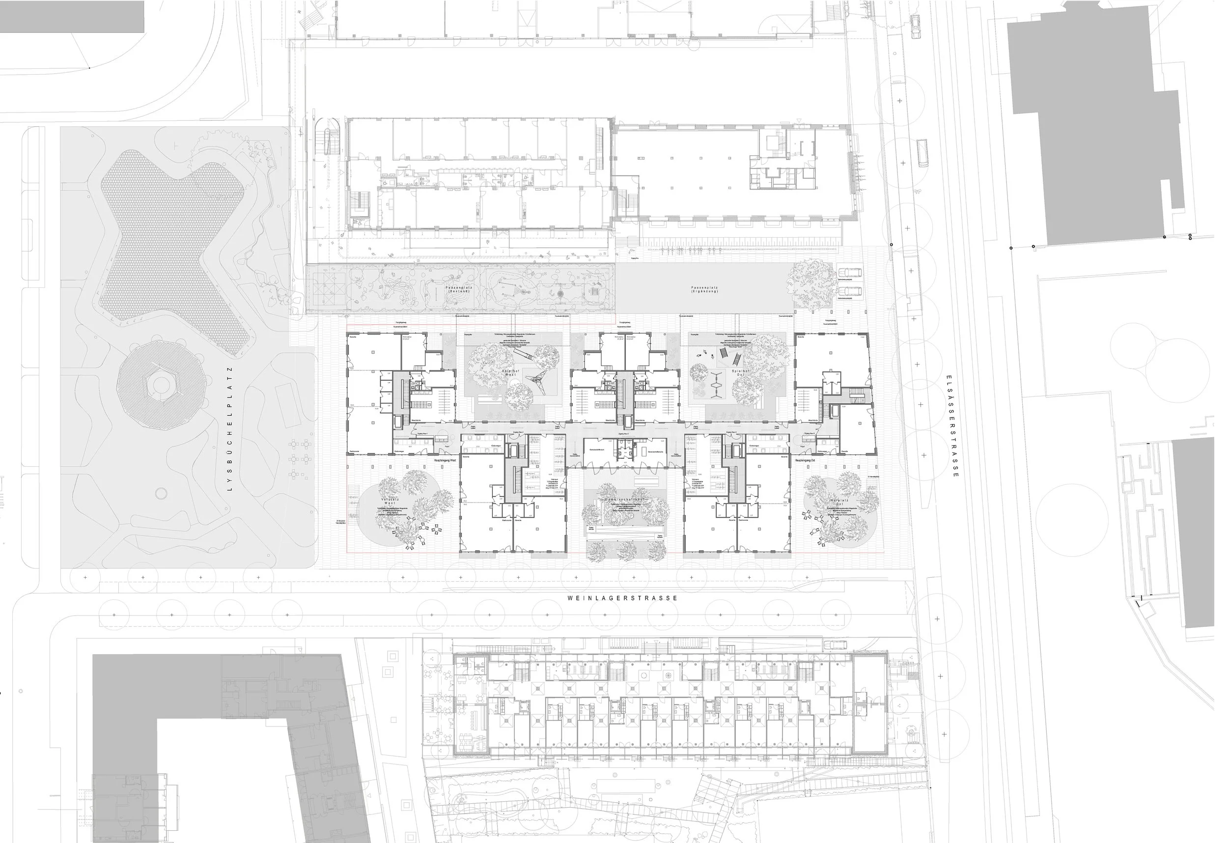 Dieser städebauliche Ansatz wird durch einen Doppelkammtypen verankert, dessen fünf Hauseinheiten und fünf Freiräume unterschiedliche Charakter entstehen lassen. An den südlichen Außenecken entstehen zwei städtische Vorplätze, welche die Weinlagerstraße an beiden Enden räumlich erweitern und somit die gedachte Quartiersquererschliessung stärken. Der östliche Vorplatz markiert den Quartierszugang von der Elsässerstrasse aus.